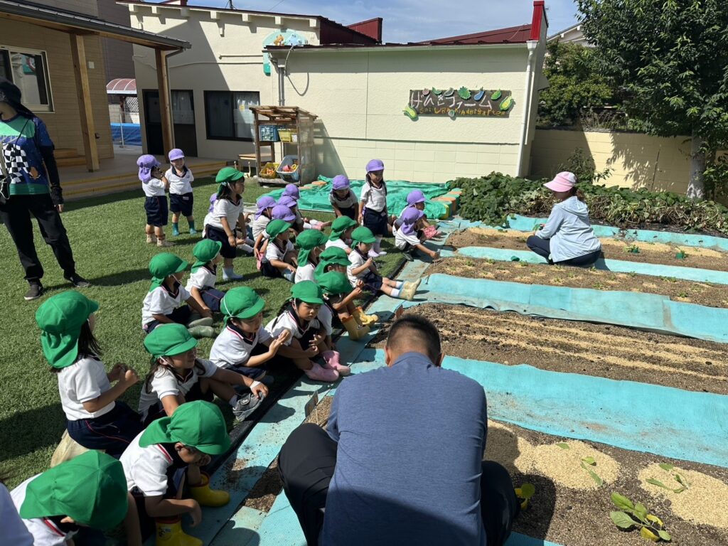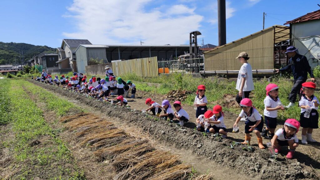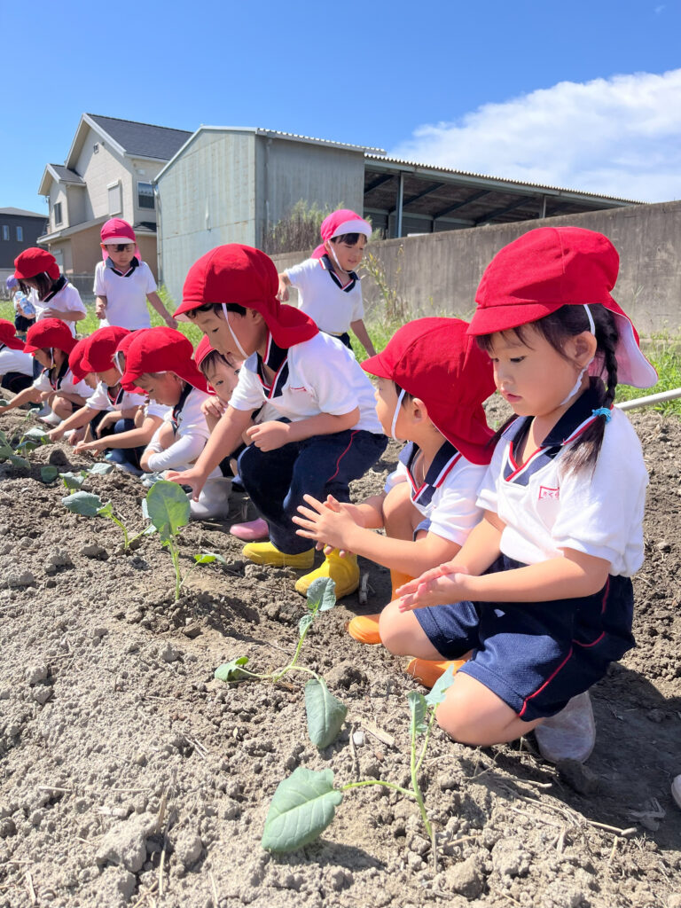 「おいしくな~れ😊」みんな上手に苗を植えることができました。