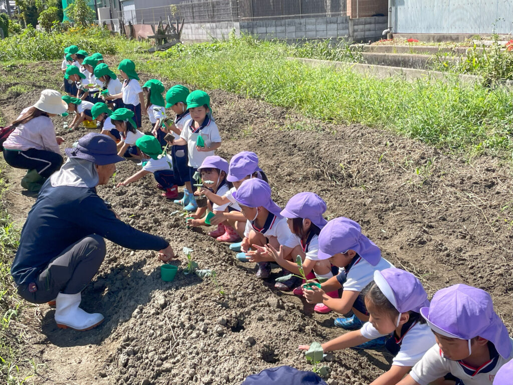 「おいしくな~れ😊」みんな上手に苗を植えることができました。