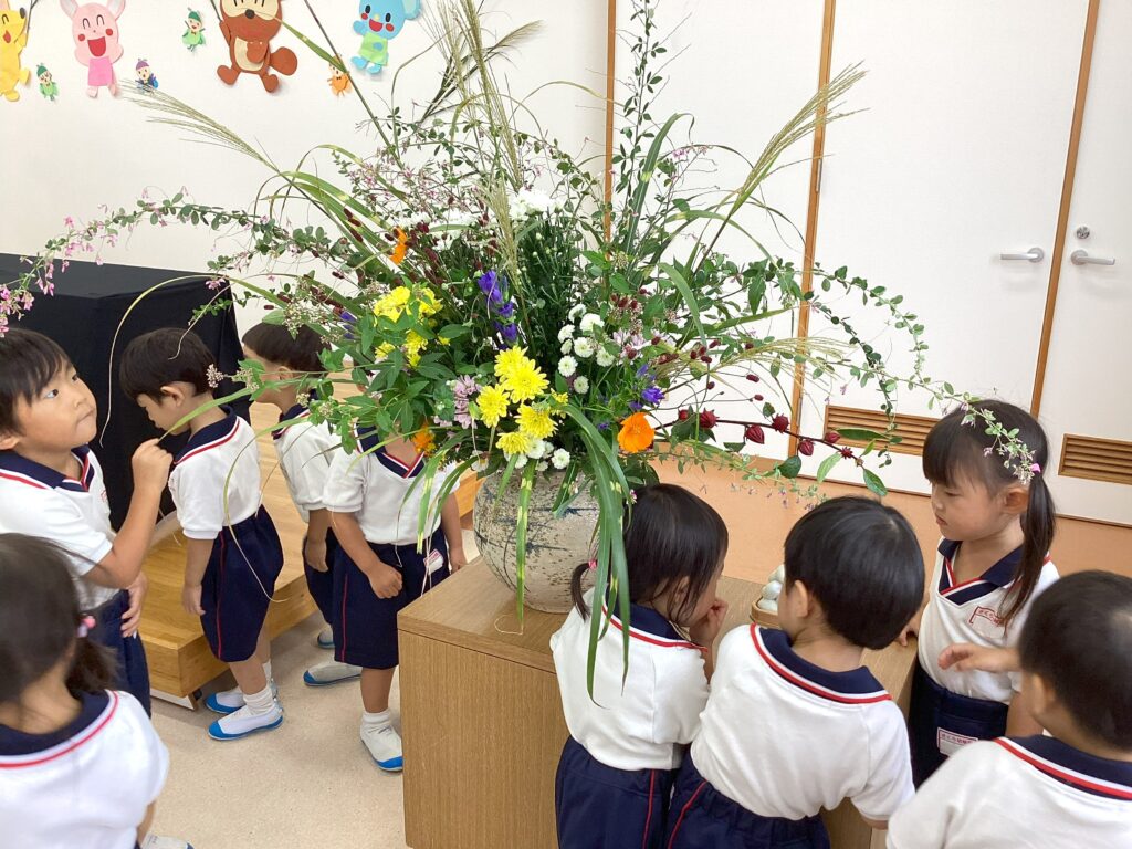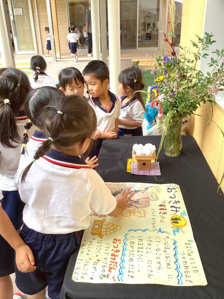 お月見の日にはススキや萩の花を飾ります。「この花はなんでしょう?」でも子ども達は隣にお供えしているお月見団子に興味津々。花より団子ですね☺