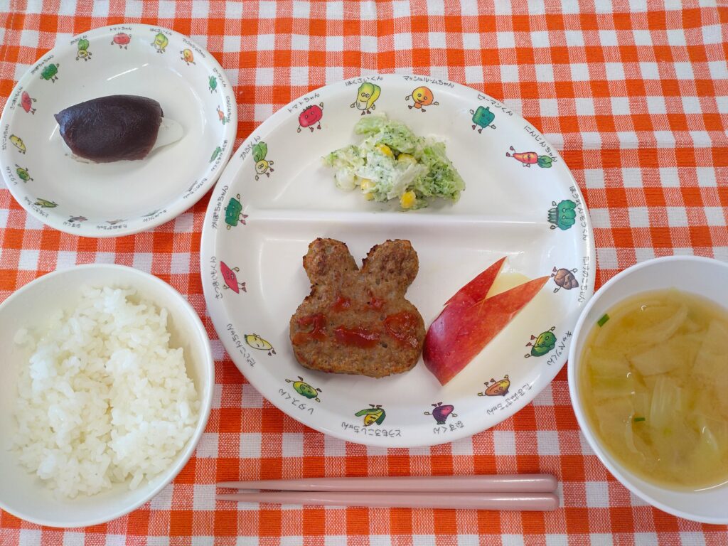 そして今日はスペシャルディ。お月見メニューです。リンゴもハンバーグもウサギさんに変身!!
