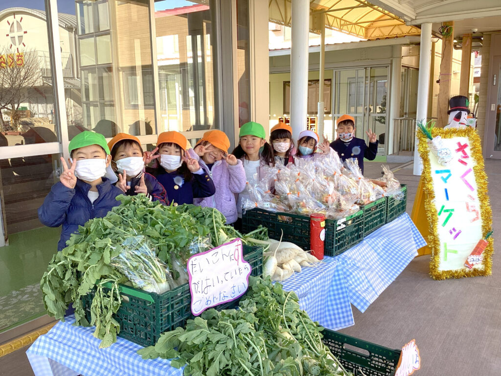 幼稚園の畑で作っている大根・ニンジン。園でも給食以外で、大根やニンジンを生野菜としていただいたり、なますにしたり、茹でブロッコリーをいただいたりしていると・・・。子ども達が「お家でも食べたい!」と話しているのを聞いて・・・。急遽、それならおみせやさんを開店することに!!その名も「さくらマーケット」
